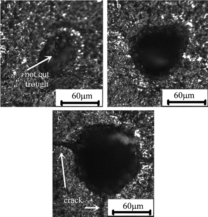 從燒蝕閾值來看,完成PCBN去除僅需要微小能量,但對于2mm厚的PCBN來講,實現高效的激光切割能量遠遠不夠,能量過小會造成如圖 3a所示的切不透現象。同時多次試驗表明,過小能量切割PCBN表面粗糙度較差。由于PCBN材料的脆硬性影響,能量過大則會出現嚴重的崩邊與裂紋,如圖 3c所示。在圖 3b中看到,孔右上角部分呈現橢圓形貌,那是因為激光光束垂直度不足導致,該現象也是導致切縫較寬表面質量差的一個重要原因。