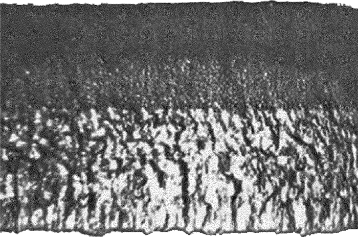 7為不同頻率下縫寬和錐度的變化曲線。其中激光功率20W,切割速率30mm/min,脈沖頻率分別為30Hz, 40Hz, 50Hz, 60Hz。從圖中看出,激光脈沖頻率對切縫寬度影響大。隨著頻率的增大,縫寬顯著減小,同時切割錐度也隨之減小。脈沖頻率的大小決定著激光光斑的重疊程度,圖 8PCBN激光切割、掰片、簡單去熔渣后斷面形貌圖。上層為PCBN,下層為硬質合金。圖中能明顯看出切割后的條紋形狀。根據單脈沖激光能量E與平均輸出功率Pave和脈沖頻率f的關系式E=Pave/f可知,隨著脈沖頻率的增加,單脈沖能量減小,光斑重疊度增大,這對表面切割質量的提高和裂紋的減少起著重要作用。